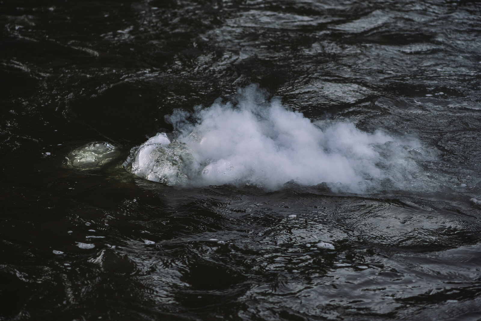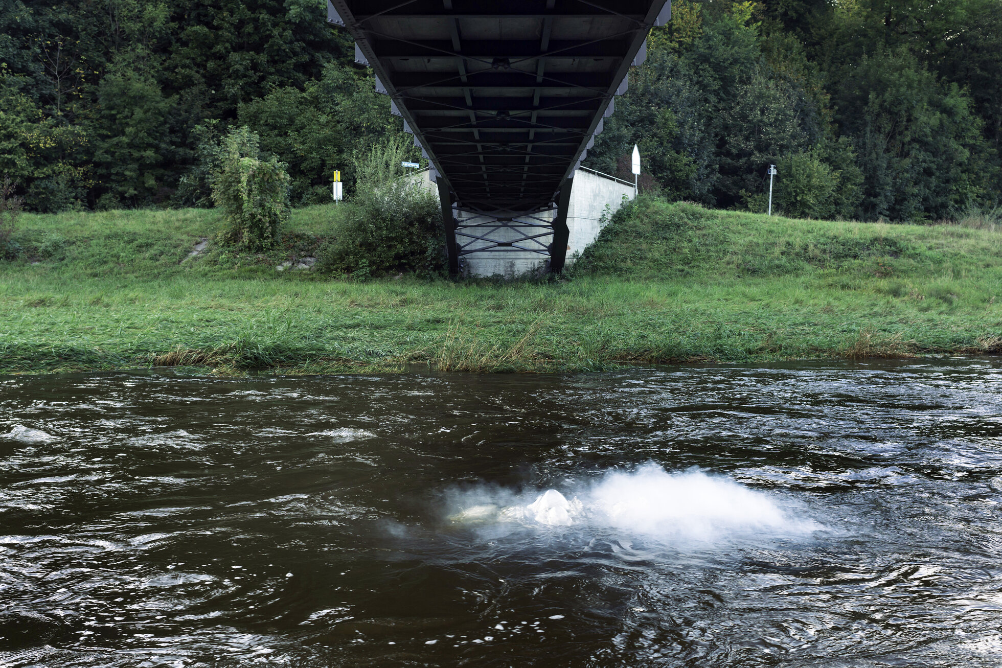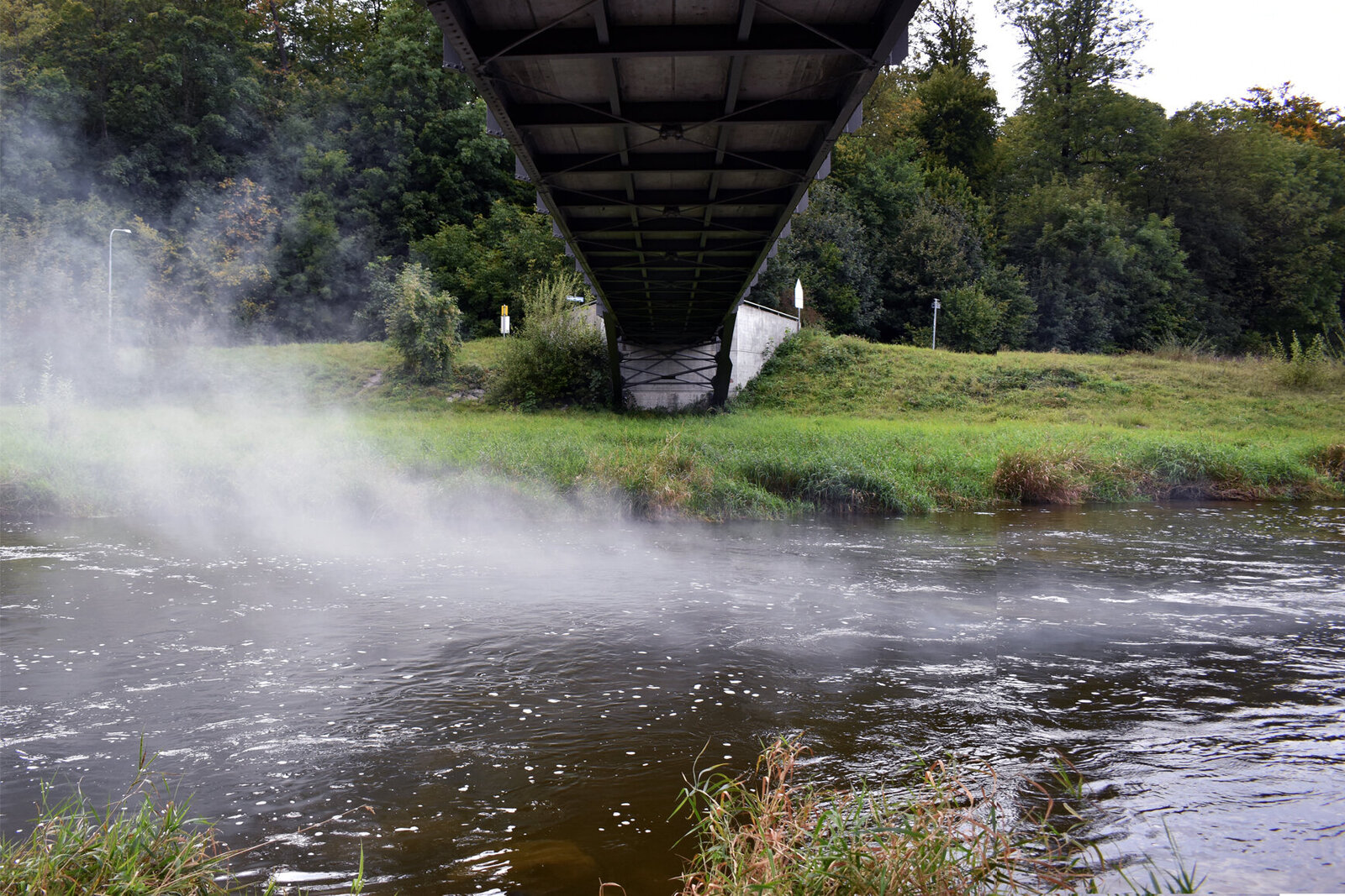 Der Rauch wird in Intervallen durch einen Schlauch in die mitte des Flusses geleitet, es beginnt mit einem leisen Blubbern, danach kommen die Nebelschwaden.