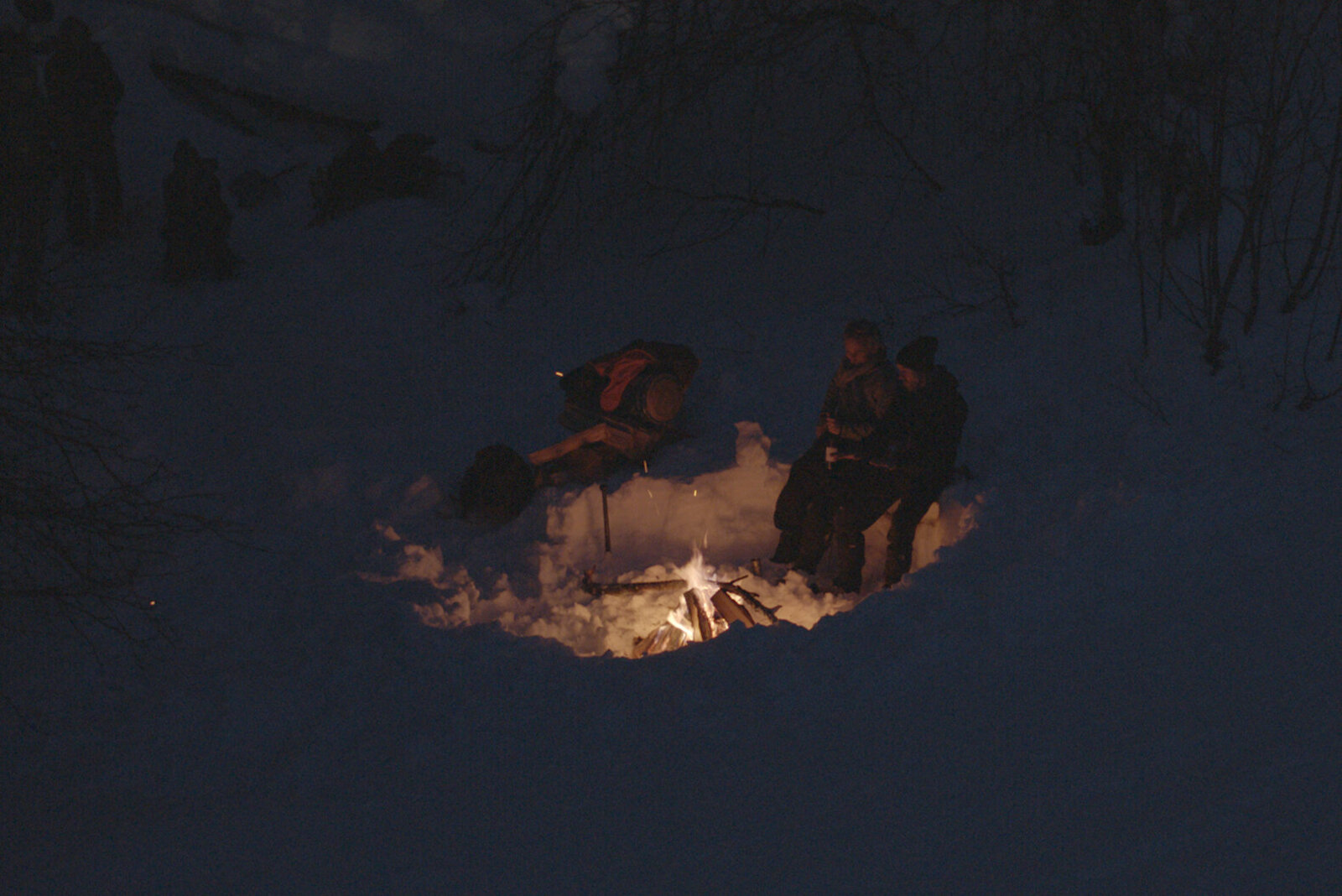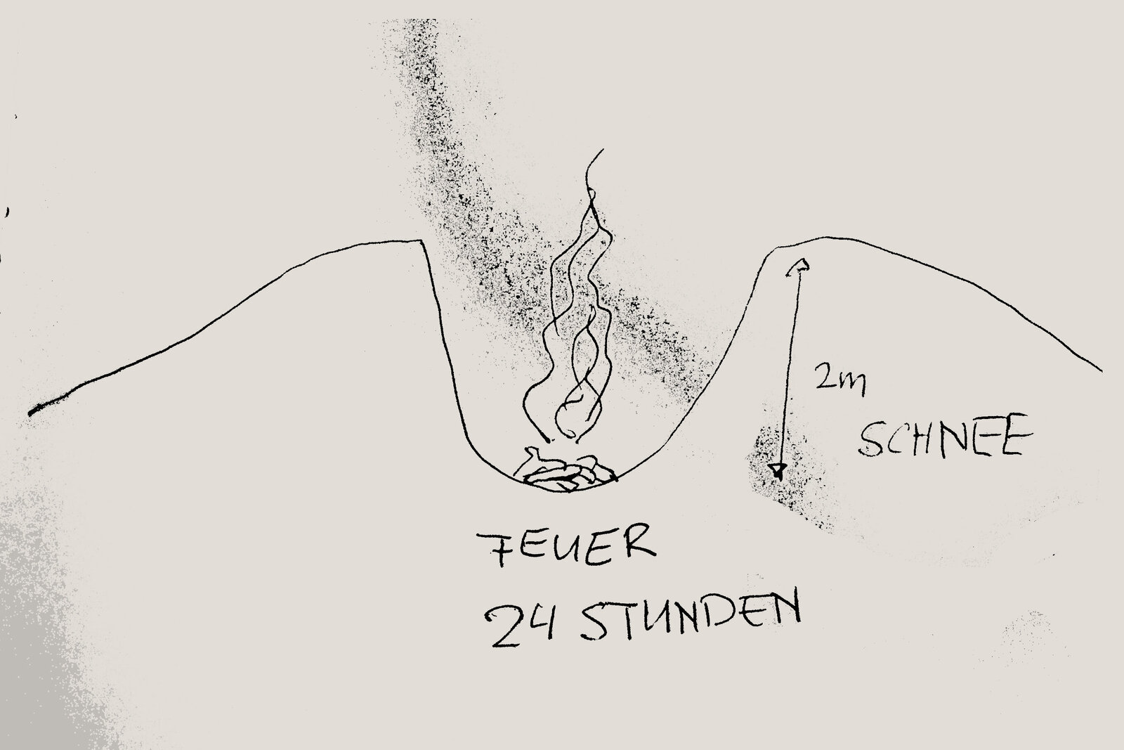 Oberhalb des Dorfes wird in einer kleinen Mulde mit Blick auf das Dorf ein Feuer gemacht, das die ganze Nacht brennt und sich ca- 2 Meter tief in den Schnee frisst. Am Morgen ist das Dorf nicht mehr sichtbar, vor uns befindet sich eine Schneewand.