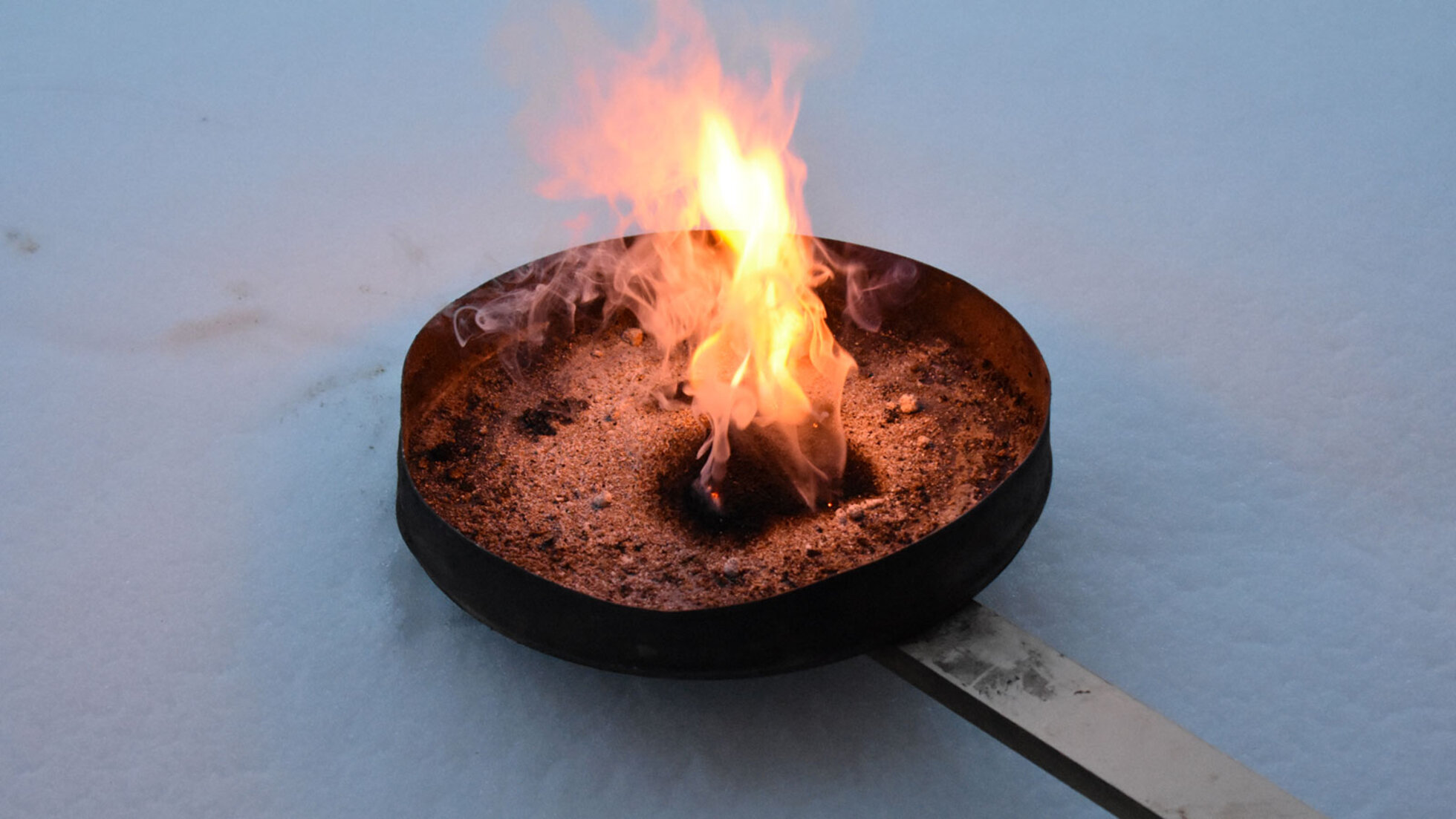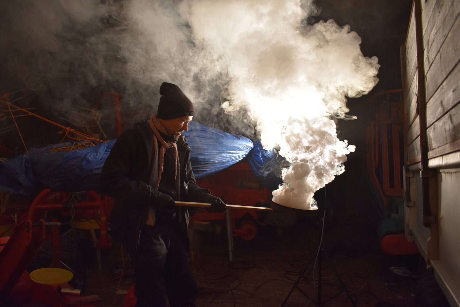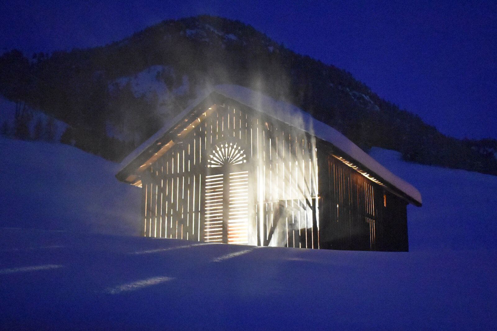 Scheune oberhalb des Dorfes wird von innen mit Scheinwerfer ausgestrahlt, mit Schalen mit Rauchpulver wird diese ausgeräuchert.